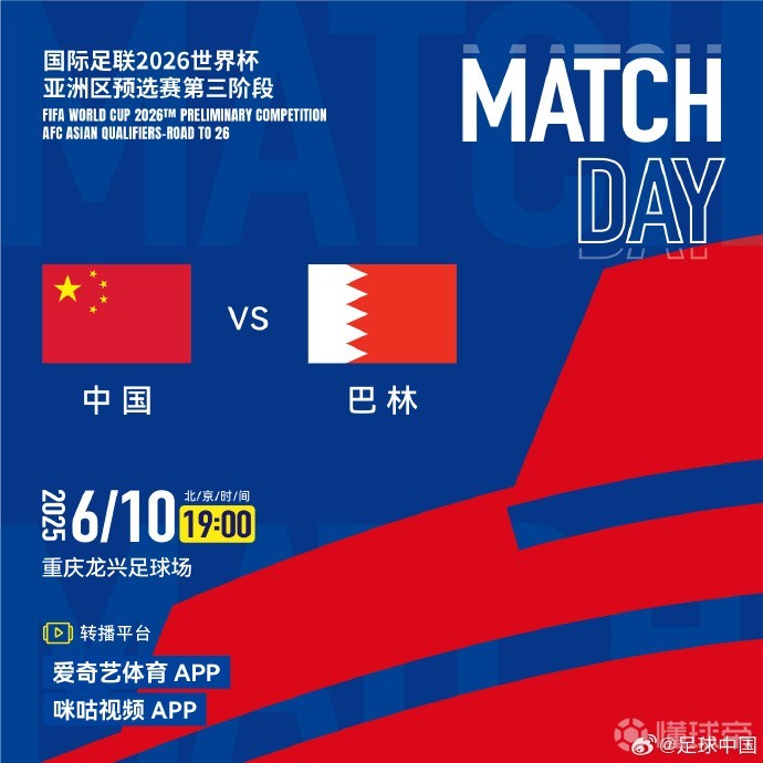 官方表示:北京时间6月10日19:00,国际足联2026世界杯亚洲区预选赛第十轮,中国国家男子足球队将在重庆龙兴足球场对阵巴林国家男子足球队。锁定以下转播平台,一起为中国队加油!
