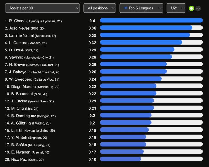 DataMB网站统计了本赛季五大联赛21岁以下球员每90分钟助攻最多的前20名球员,其中谢尔基0.4次居于榜首,若昂-内维斯0.36次第二,亚马尔0.35次第三。