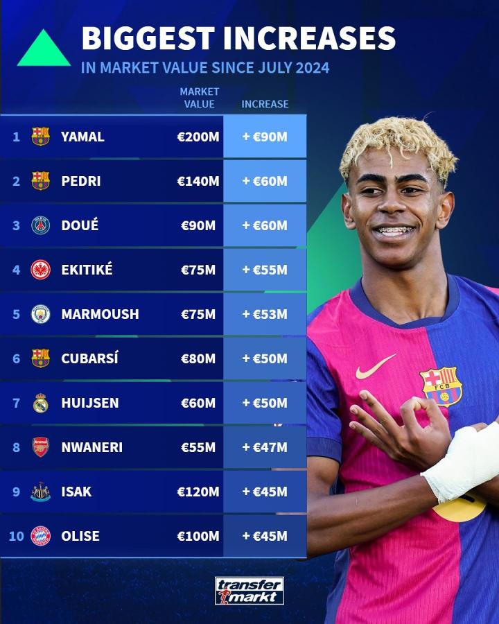 在完成西甲球员身价更新后,德国转会市场网站列出了自2024年7月以来球员身价上涨榜,亚马尔上涨9000万欧居首。