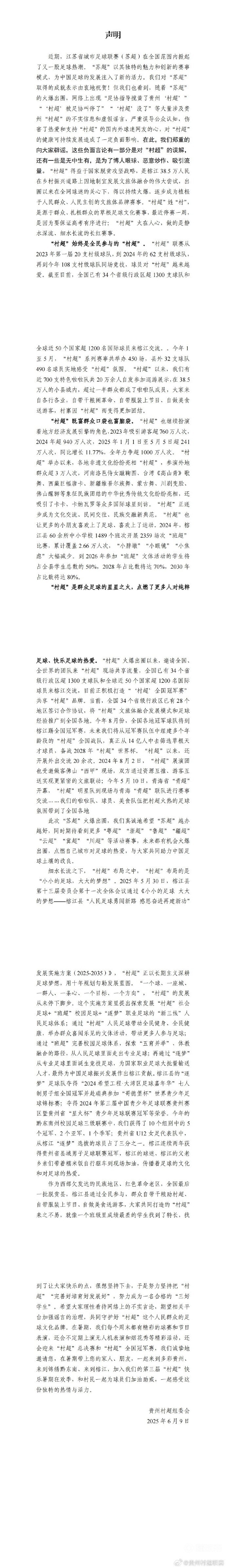 6月9日,贵州村超联赛组委会官方发布了一份声明,对近期外界的一些谣言进行了回应,并祝贺“苏超”联赛的火爆。