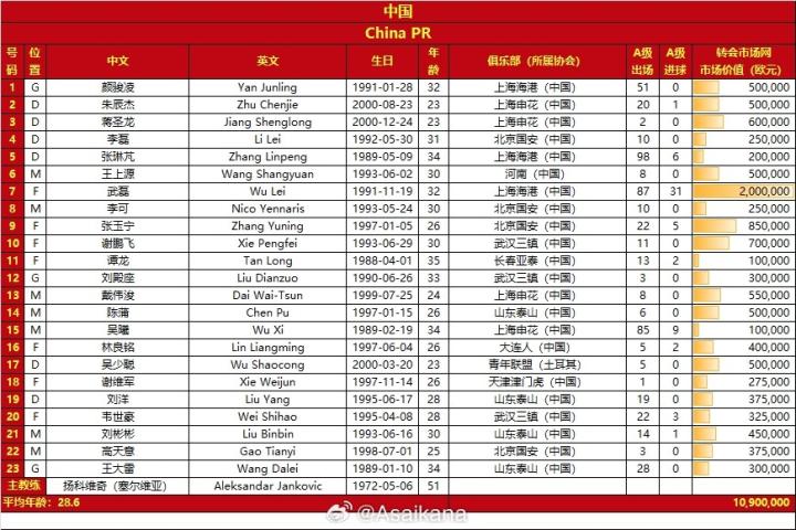 对比两场比赛的大名单,仅有8名球员仍在大名单中,分别是门将颜骏凌、刘殿座、王大雷,后卫李磊、吴少聪,中场王上源以及前锋张玉宁、林良铭。随着部分老将淡出国家队和新鲜血液的补充,球队平均年龄从此前的28.8岁降至28.3岁。同时,球队的总身价也出现了小幅下滑,由1090万欧元降至990万欧元。