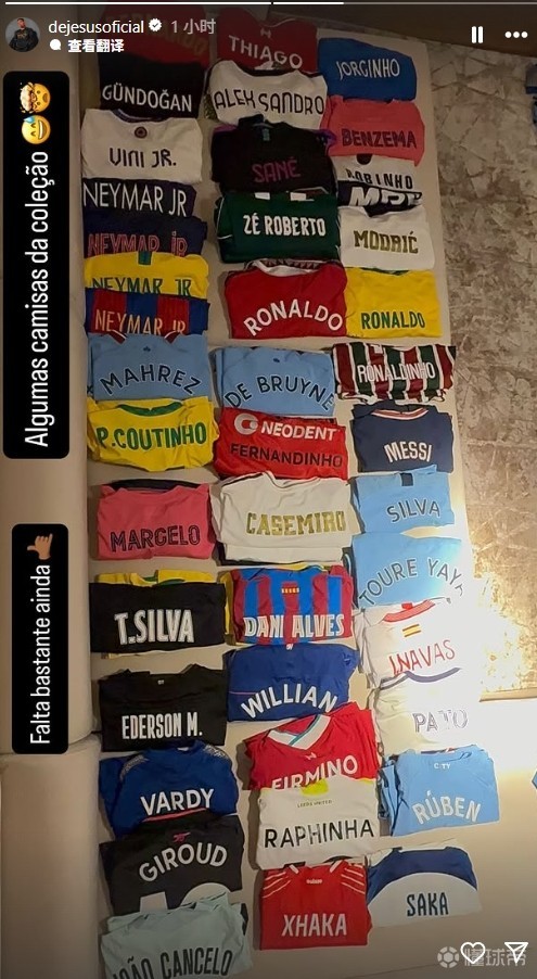 热苏斯写道:“这是我收藏的一些球衣,还有很多没在照片内。”