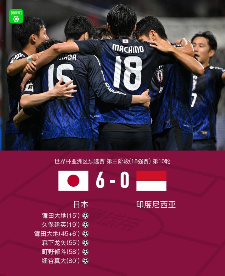 日本6-0零射门印尼,镰田大地双响,久保建英、町野修斗2传1射
