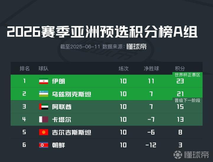 A组的悬念在第9轮比赛过后就已经全部终结,伊朗和乌兹别克斯坦成功晋级世界杯决赛圈,阿联酋和卡塔尔进入附加赛,吉尔吉斯斯坦和朝鲜则被淘汰出局。
