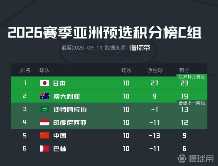 C组的澳大利亚在末轮击败沙特阿拉伯之后和日本携手晋级世界杯决赛圈,沙特阿拉伯则只能和印度尼西亚一同参加附加赛,国足和巴林则早已提前出局。