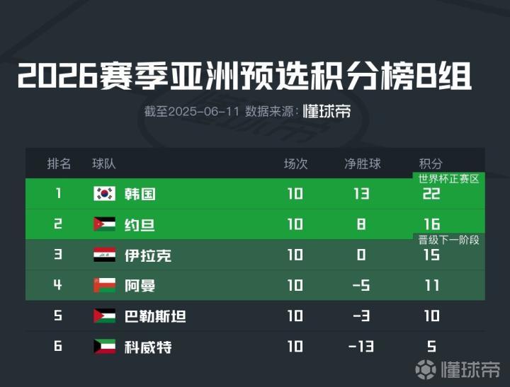 B组的韩国和约旦此前已经提前晋级世界杯决赛圈,伊拉克在末轮击败约旦之后确保了附加赛资格,阿曼在少打一人的情况下补时点球绝平巴勒斯坦之后也惊险进入附加赛,巴勒斯坦则错失好局和科威特一同惨遭淘汰。