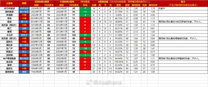 德转管理员朱艺发布微博,统计了近30年以来国足历任主教练的执教战绩。其中现任主教练伊万科维奇和前任主帅扬科维奇执教胜率不足30%;李铁下课后的接任者李霄鹏胜率为0%。近30年来只有这三位主教练的执教胜率不足30%。