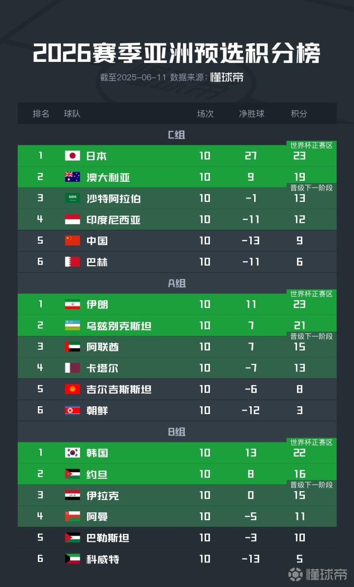 6月11日凌晨,世界杯亚洲区18强赛全部结束,从积分榜上来看,第一档和第五档的球队发挥稳定,最后排名和档次完全符合。