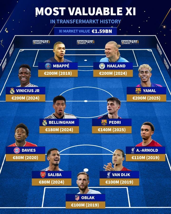 德国转会市场在25周年之际列出该网站历史身价最贵阵容,哈兰德、姆巴佩、亚马尔、维尼修斯以2亿欧领衔。