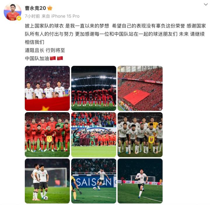 6月11日,结束了国足世预赛征程的曹永竞在社交媒体上晒出了九宫格,总结这次国足旅程。