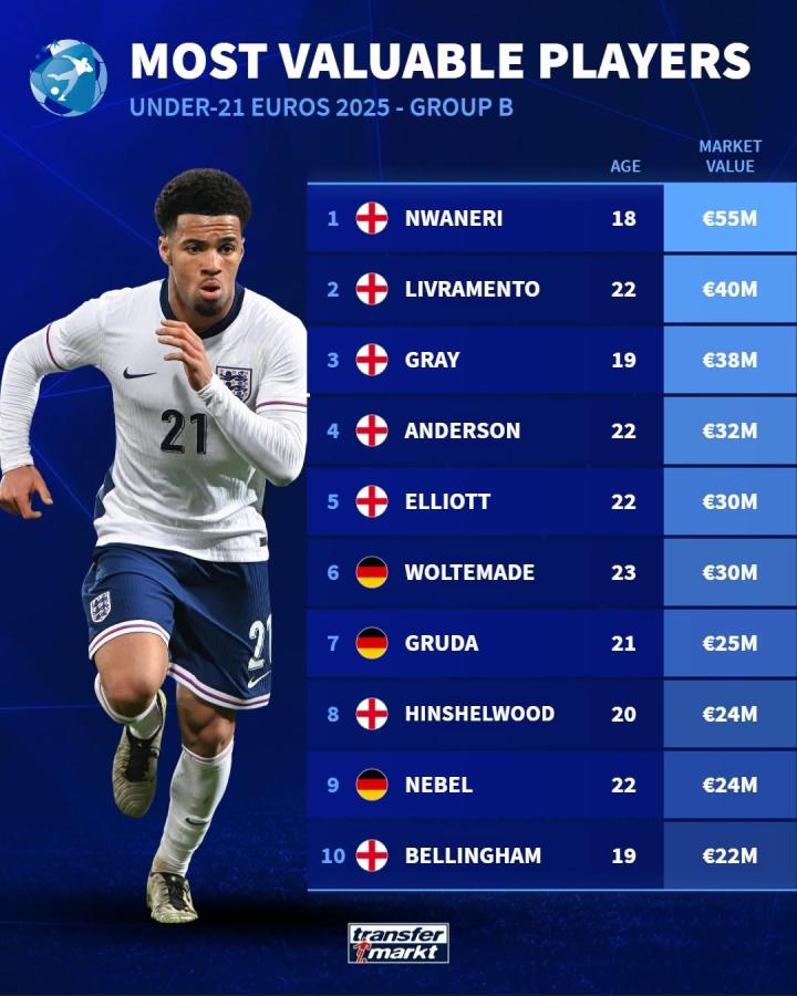 北京时间6月12日,德国转会市场统计了2025年U21欧洲杯B组球员的最新身价榜单。