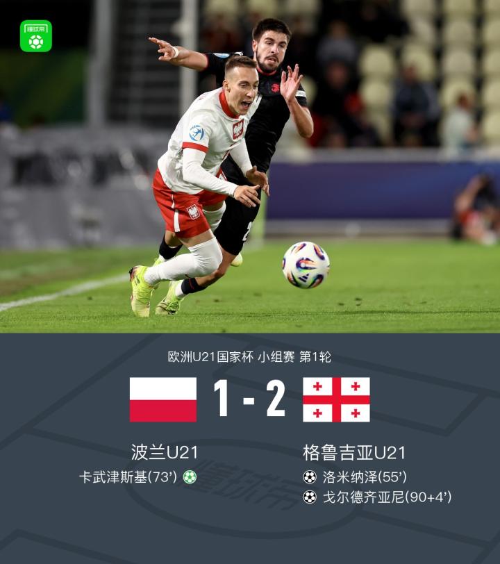 欧青U21格鲁吉亚2-1波兰,洛米纳泽破门,戈尔德齐亚尼补时绝杀