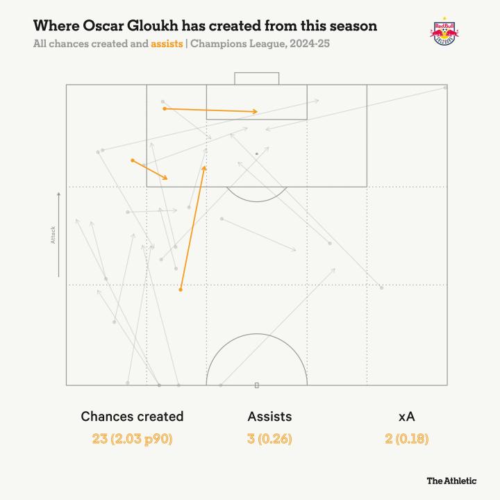 然而,格洛赫仍然承担着球队大量的组织重任。在本赛季的欧冠中,他创造了23次机会,是队内排名第二的萨尔茨堡球员的两倍多。如下图所示,他的许多传球都是直接的向前输送,从左肋部区域直塞给前方的跑动队友。