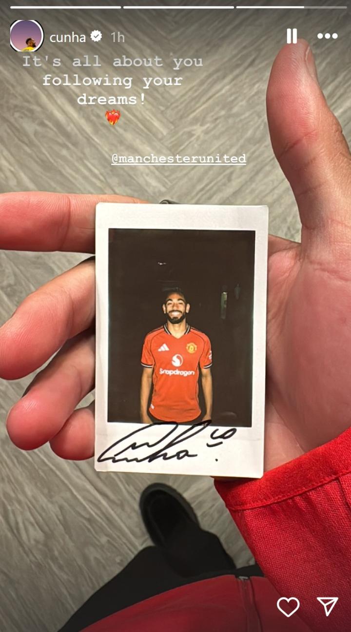 曼联新援马特乌斯-库尼亚更新了社媒,他晒出了自己身穿曼联新赛季球衣的一张照片。