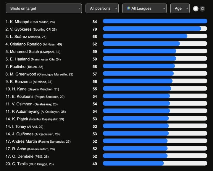 北京时间6月12日,数据网站DataMB统计了2024/25赛季全球各大联赛球员射正次数排行榜。皇马球星姆巴佩以84次射正高居榜首,哲凯赖什79次列次席。