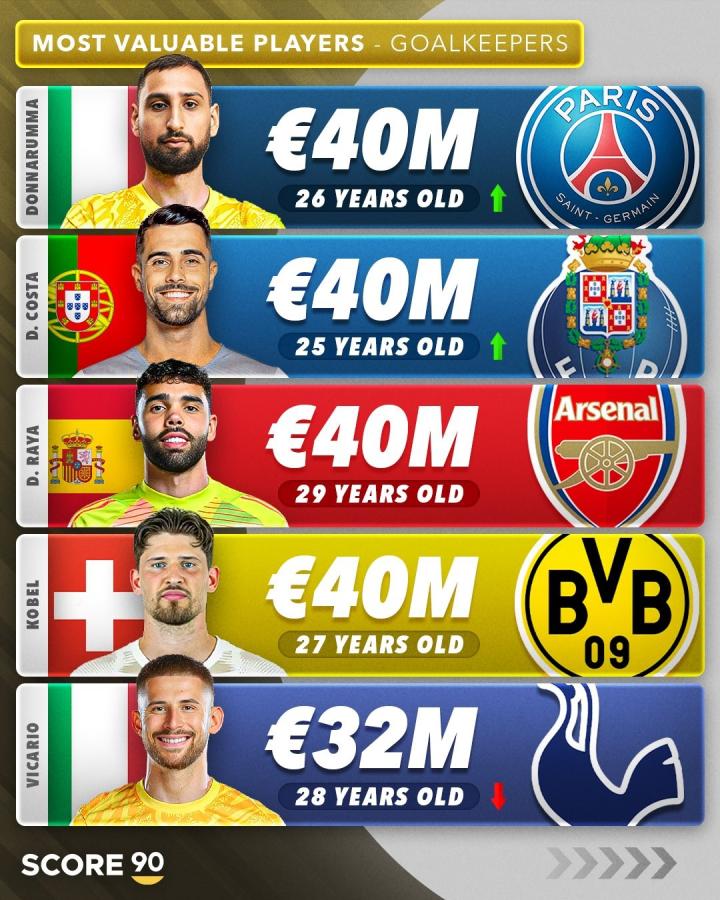 其中,巴黎圣日耳曼门将多纳鲁马、波尔图门将迪奥戈-科斯塔、阿森纳门将戴维-拉亚以及多特蒙德门将科贝尔四人并列第一,身价均为4000万欧元。热刺门将维卡里奥则以3200万欧元排名第五,稍低于榜首四人。