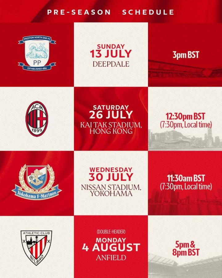 北京时间6月13日,英超冠军利物浦公布了2025-2026赛季的季前赛赛程,他们将先后对阵普雷斯顿、AC米兰、横滨水手以及毕尔巴鄂竞技。