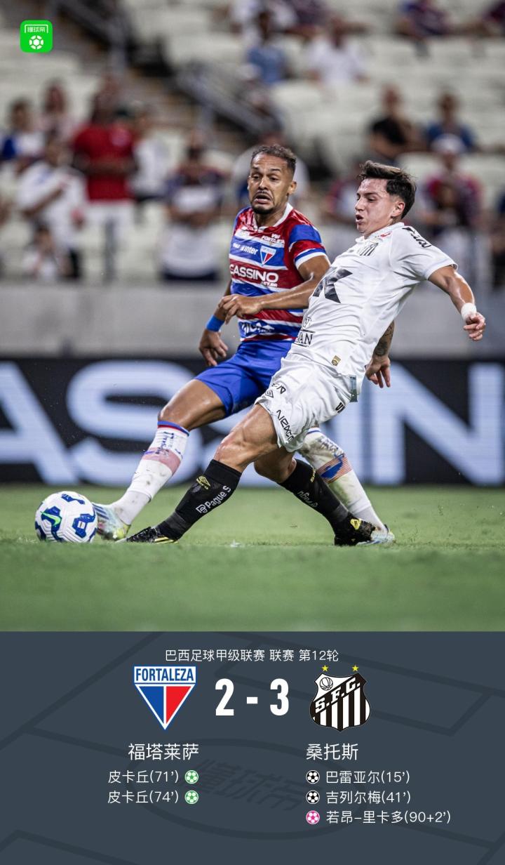 桑托斯3-2福塔莱萨,罗埃塞传射,皮卡丘点射双响,巴雷亚尔建功
