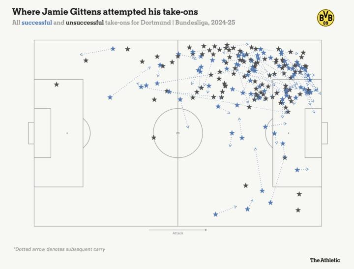 他是一名劈风斩浪型的边锋,某种意义上带有些“老派”风格。他在一对一时极具威胁,脚下频率极快,盘带风格令他可以轻松从两侧突破对手,然后用极小的起脚幅度施以强力射门。他在2024年打进的那些进球既暴烈又充满艺术感,往往也极具决定性。在整个赛季中,没有任何德甲球员的过人尝试次数超过他,吉滕斯尤擅长从左路内切冲击禁区(见下图)。