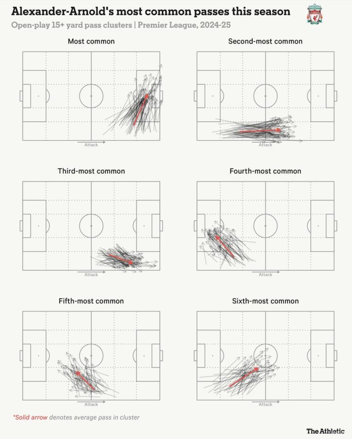 尤为关键的是,在2024/25赛季,亚历山大-阿诺德回归到了更加“传统”的边后卫角色。在克洛普执教的最后一个赛季,利物浦曾尝试让他在出球阶段内收至中路,但如今这位26岁的球员又回到了熟悉的右边线区域。他的传球分布图(见下)显示了他频繁向前场或禁区送出具有威胁的传球。
