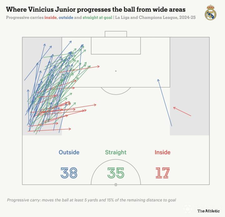 无论维尼修斯在门前把握机会的稳定性如何,他自由奔放的盘带风格依旧引人注目,且难以预测。