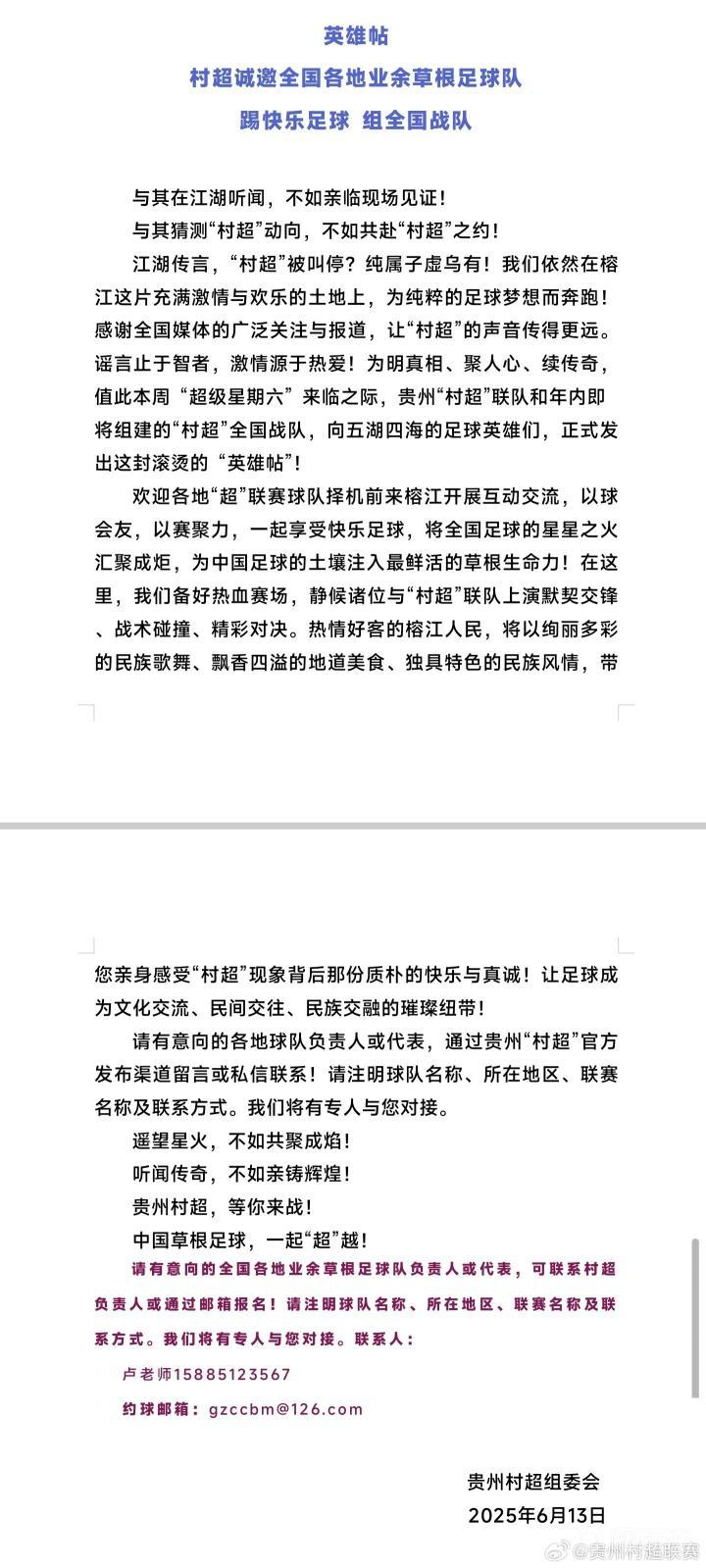 北京时间6月13日,贵州村超官方发布英雄帖,诚邀全国各地业余草根足球队参赛。