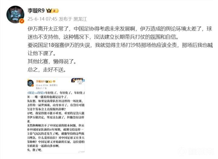 “要说国足18强赛伊万的失误,我就觉得主场打沙特那场他应该全责(18强赛第2轮国足主场被沙特逆转绝杀,1-2告负),那场比赛后我也喊让他下课了。其他比赛,懒得说了。总之,走好不送。 ”