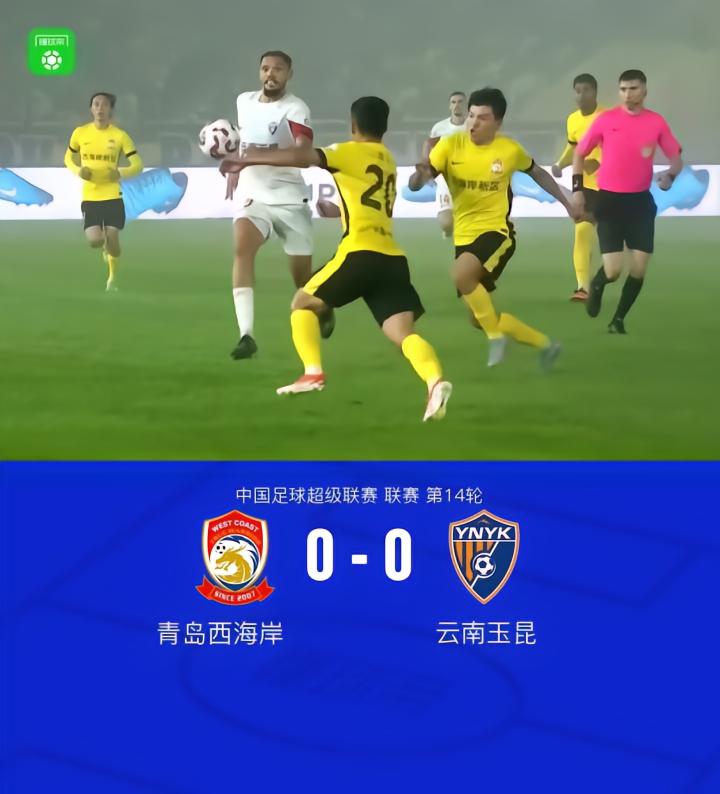 青岛西海岸0-0云南玉昆,阿齐兹垫射造险,韩子龙失良机