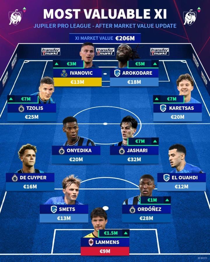 北京时间6月14日,德国转会市场网站更新了比利时甲级联赛球员的最新身价,并据此评选出身价最高的阵容。