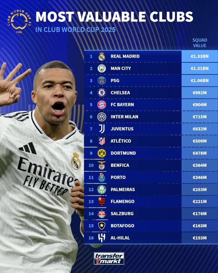 2025年世俱杯即将打响,转会市场网统计了32支参赛队的总身价并进行了排名。