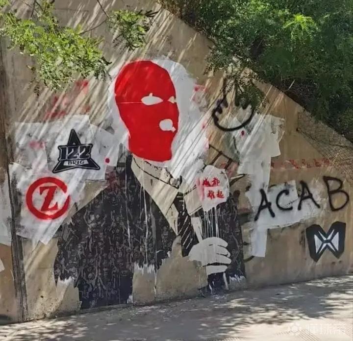 而在遭到破坏后,画像中胡葆森的面部被涂上了红漆,手中话筒上的字样也被改为了“成都雄起”。此外,画像旁边还被添加了“122 BRIG”的字样,这是成都红色刀锋球迷会一个小组的名字。