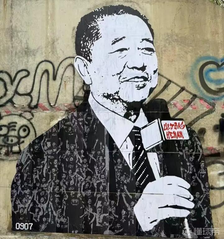 这张胡葆森的画像以涂鸦的形式被画在墙上,原图当中,胡葆森的西装上还绘有河南球迷在看台上的形象,他手中的话筒上写着“Ultras Henan”。
