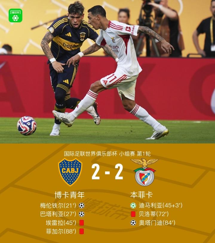 十人博卡青年2-2十人本菲卡,迪马利亚点射,奥塔门迪救主