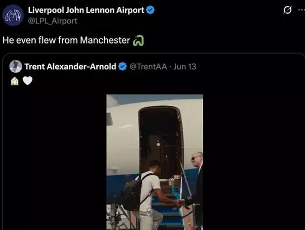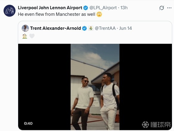 近日,利物浦约翰-列侬机场在阿诺德离开英国飞往西班牙后,转发了阿诺德社交媒体的动态,表示:“他甚至从曼彻斯特起飞。”还配上了一条蛇的表情符号。(蛇在西方文化中可解读为背叛)