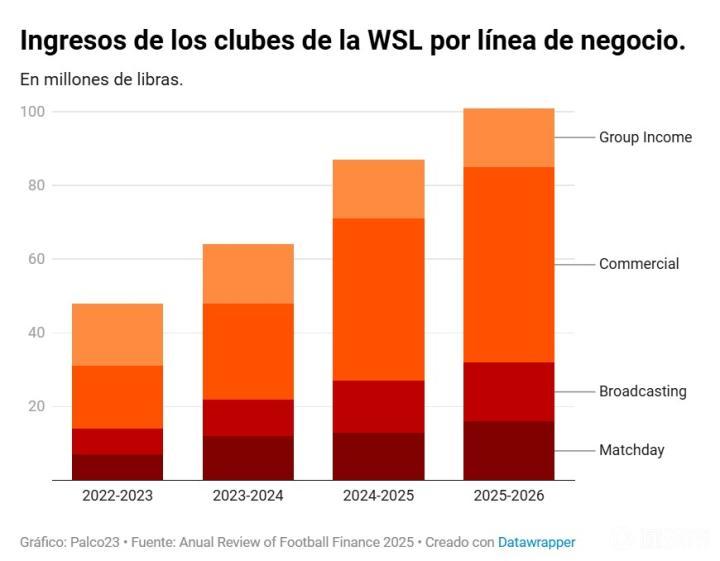 2023-2024赛季,WSL俱乐部的平均收入为540万英镑(630万欧元),高于前一赛季的400万英镑(470万欧元),相当于增长了34%。