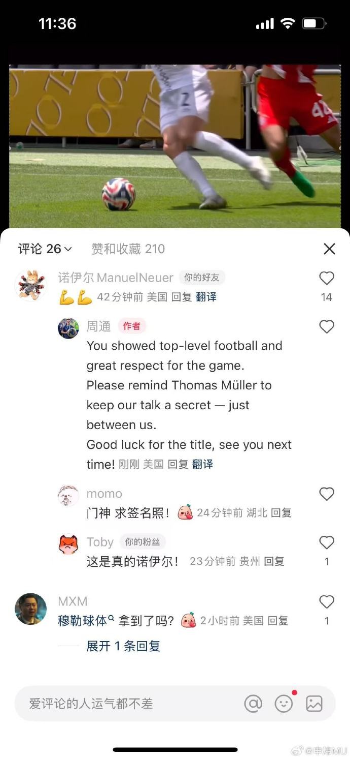 北京时间6月16日,世俱杯小组赛第1轮,奥克兰城0-10不敌拜仁慕尼黑。赛后,效力于奥克兰城的中国球员周通在小红书发布了个人集锦,并表示“感谢拜仁对足球的尊重”。值得一提的是,拜仁门将诺伊尔现身评论区,“排面拉满”。