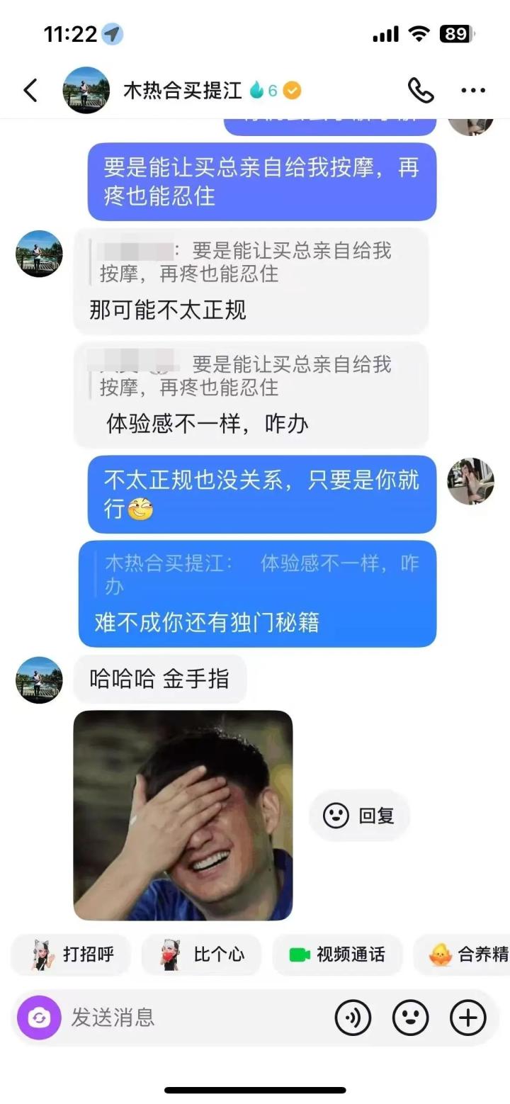 还有一段记录中,女球迷表示,想要买提江给她按摩,买提江说:那可能不太正规,体验感不一样。女球迷进一步说:不太正规也没关系,难不成你还有独门秘籍。买提江则表示:哈哈哈,金手指。