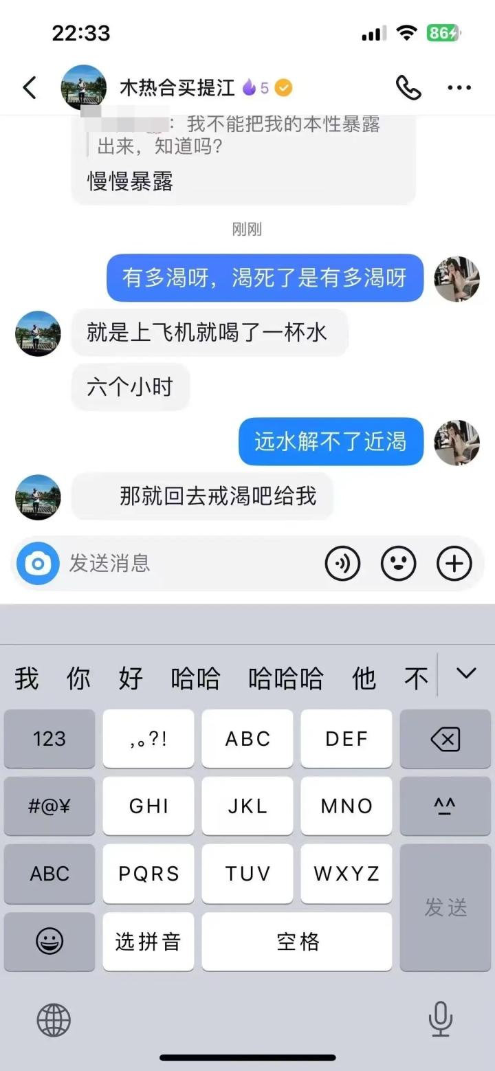 另一段聊天记录显示,买提江说自己上飞机就喝了一杯水,女球迷则撩拨道:远水解不了近渴。心领神会的买提江表示:那就回去解渴吧给我。