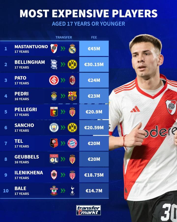 皇马签下小将马斯坦托诺已经官宣,德转统计了U17球员转会费TOP10,马斯坦托诺第一,贝林第二,佩德里第四,桑乔第六。