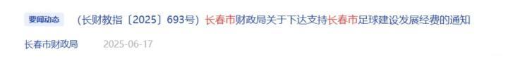 北京时间6月17日,掌上长春报道,长春市财政局发布关于下达支持长春市足球建设发展经费的通知:现一次性下达支持长春市足球建设发展经费2000万元,用于支持长春市落实专题会议精神,支持中超俱乐部建设发展。