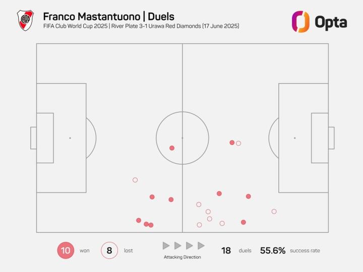 北京时间6月18日,2025年世俱杯小组赛继续进行,阿根廷球队河床以3-1击败日本球队浦和红钻,顺利收获开门红。年仅17岁的河床新星马斯坦托诺在比赛中表现抢眼,完成了多达18次身体对抗,成功赢下其中10次,对抗成功率达到55.6%。