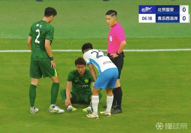 在北京国安与青岛西海岸的比赛第6分钟,林良铭在边线处无对抗倒地,简单处理后无法坚持比赛,被替换下场。