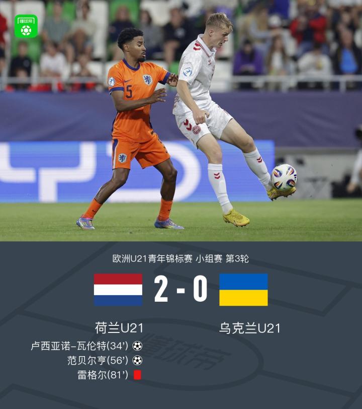 十人U21荷兰2-0乌克兰U21,瓦伦特破门,范贝尔亨建功