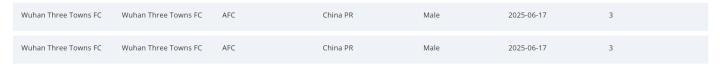 FIFA转会禁令公示网站显示,武汉三镇新增两条有效期从2025年6月17日开始的转会禁令。