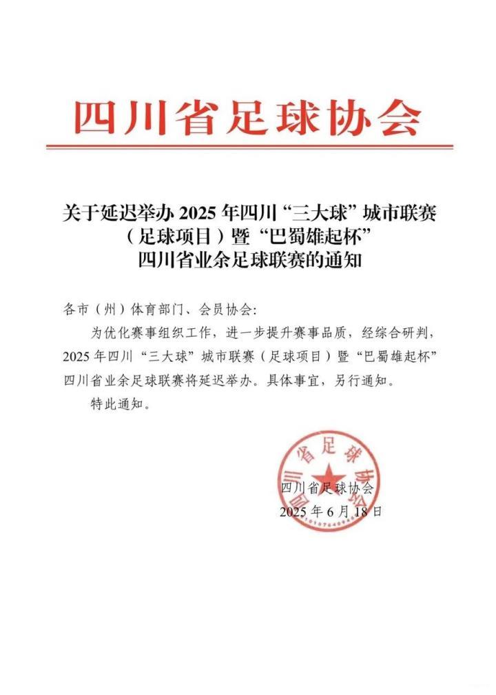 6月19日晚,据四川省足协消息,官方发布了《关于延迟举办2025年四川“三大球”城市联赛(足球项目)暨“巴蜀雄起杯”四川省业余足球联赛的通知》。