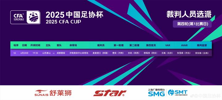 北京时间6月20日,足协杯第四轮第1比赛日的裁判名单公布,麦麦提江执法山东泰山vs成都蓉城。