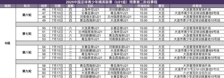 U21联赛预赛第二阶段赛程公布,比赛将于7月10日-17日在大连进行,本阶段无H组的比赛。