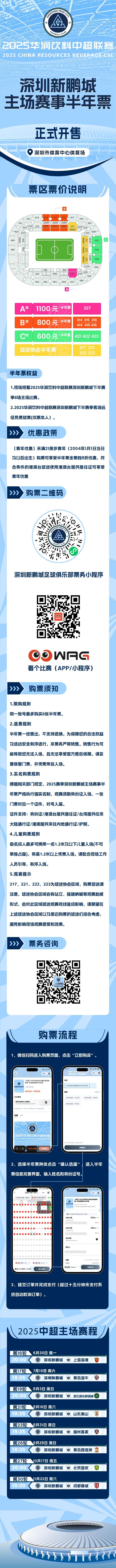 深圳新鹏城半年票正式开售,C类的价格为600元,看台为421、422、523。B类的价格为800元,看台为214、215、216、414、415、416。A类为1100元,看台为227。