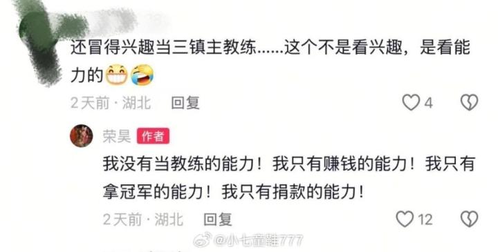 荣昊回复道该球迷:“我没有当教练的能力!我只有赚钱的能力!我只有拿冠军的能力!我只有捐款的能力!”