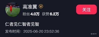 北京时间6月20日晚,2025中国足协杯1/8决赛,山东泰山主场1-3不敌成都蓉城,被淘汰出局。赛后,山东泰山球员高准翼在社交媒体里写道:“仁者见仁智者见智。”